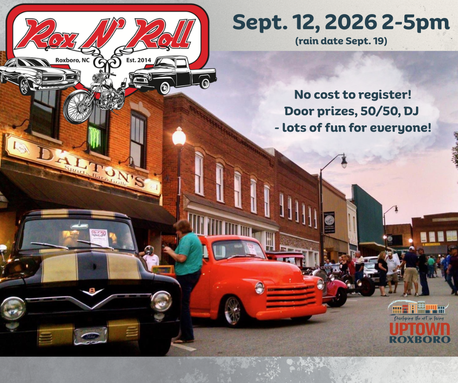 Join us in Uptown Roxboro for the first Rox N Roll Cruise-In of the season on Saturday, September 12, 2026 from 2–5 PM! Bring out your classic cars, trucks, and motorcycles to show off and enjoy an afternoon filled with community fun.